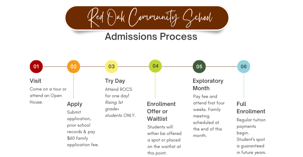 The Exploratory Month ends after the first four weeks of attendance, when each family will meet with Red Oak staff to discuss how the student is adjusting to school at Red Oak. If at that point the staff and family is in agreement that it is appropriate, full and continuous enrollment is offered and you move to the final ‘Step Seven’-