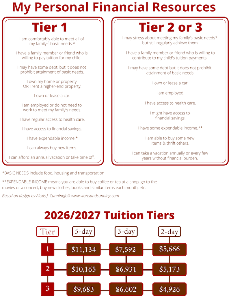 It can be complicated to do an honest assessment of your family’s financial experience, so we’ve provided a graphic below to help you decide which tuition tier is appropriate for your family-