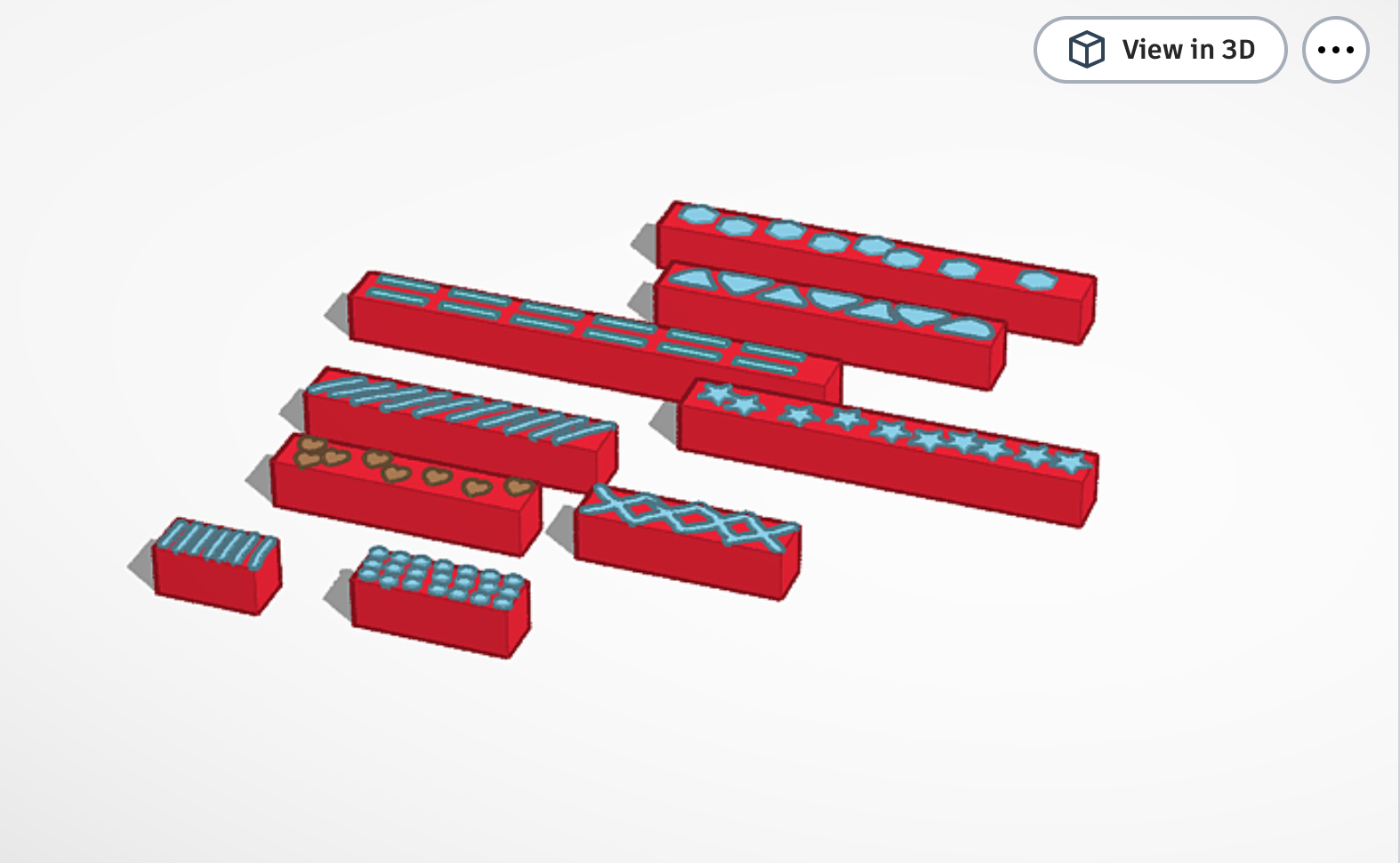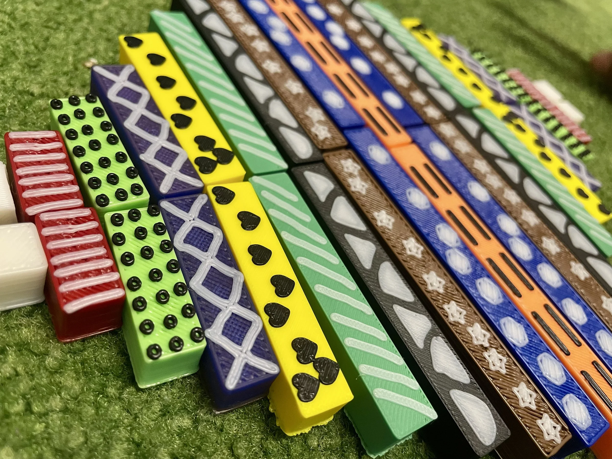 We started by doing some trials. It took a while to figure out the best patterns to use – I had thought we could pull 2D pre -made patters from online and attach them to the top layer of the rods, but I learned quickly it was not that easy. My son stepped in and found a better way – designing them from scratch in a program called Tinkerkad. He used the dimensions of the original rods to build ten 3D models, 1 of each size. Then, using the library of 2D shapes in the program, he experimented with which ones would make the best patterns, and layered them on top of each rod. We printed a test set, took them to Kali, and took account of her adjustments.